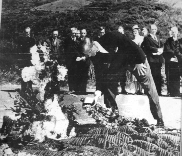 The Duke of Edinburgh places a wreath at the mass funeral in Wellington for victims of the Christmas Eve rail disaster at Tangiwai. Getty Images