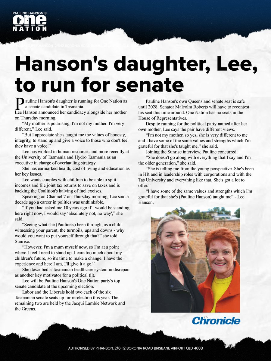 It is this combination of corporate polish, community awareness, and family-first values that has already begun to reshape One Nation’s image in Tasmania. While the party’s style may be inherited, Lee’s approach is unmistakably her own - quiet, disciplined, and focused on results rather than headlines.